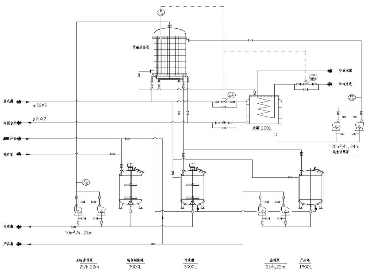 現(xiàn)今降膜結(jié)晶器技術(shù)已大量使用, 工廠規(guī)模達大中型, 生產(chǎn)的產(chǎn)品范圍寬。此法已大量取代了靜態(tài)結(jié)晶器生產(chǎn)禁, 取代苯及一抓乙酸的結(jié)晶熔融。此法也用于提取超高純的各種單體。它沒有結(jié)晶器常有的溢流現(xiàn)象, 用熔融液膜連續(xù)下降流過冷卻面, 在冷卻面上成長成結(jié)晶層, 在固液相接觸界面上的剪切力能迅速把雜質(zhì)傳送到粗滯的熔融液中, 使結(jié)晶特別迅速地成長, 并使得相間穩(wěn)定。當結(jié)晶固相成長速率超過每小時時,比靜態(tài)結(jié)晶器的速率快倍地成長。