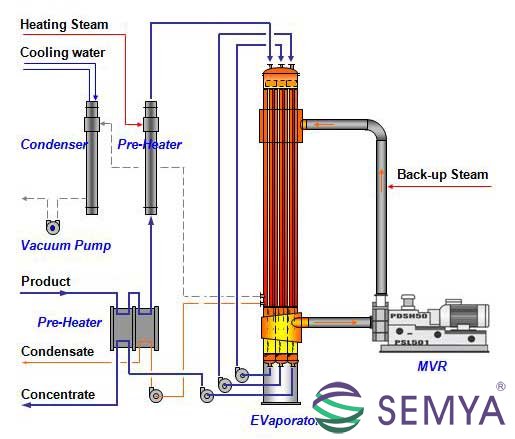 蒸汽機(jī)械再壓縮蒸發(fā)器簡(jiǎn)稱MVR蒸發(fā)器,相較于傳統(tǒng)的多效蒸發(fā),是一種高效、節(jié)能的技術(shù)。MVR蒸發(fā)器是指機(jī)械式熱能壓縮蒸發(fā)器,是國(guó)際上二十世紀(jì)九十年代末開發(fā)出來的新型高效蒸發(fā)設(shè)備。其工作原理是蒸發(fā)器產(chǎn)生的二次蒸汽經(jīng)機(jī)械式熱能壓縮機(jī)(類似于鼓風(fēng)機(jī))作用后,溫度提升5~8℃,返回用于蒸發(fā)器的加熱熱源,新鮮蒸汽僅用于補(bǔ)充熱損失和補(bǔ)充進(jìn)出料熱焓,從而大幅度減低蒸發(fā)器對(duì)外來新鮮蒸汽的消耗。原來要廢棄的蒸汽就得到了充分的利用,回收了潛熱,又提高了熱效率,生蒸汽的經(jīng)濟(jì)性相當(dāng)于多效蒸發(fā)的30效,減少了對(duì)外部加熱及冷卻資源的需求,降低能耗,減少污染。