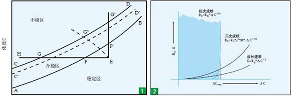 根據(jù)大量試驗(yàn)的結(jié)果證實(shí),溶液的過(guò)飽和與結(jié)晶的關(guān)系可用上圖1表示;圖中的AB 線(xiàn)為普通的溶解度曲線(xiàn),CD 線(xiàn)代表溶液過(guò)飽和而能自發(fā)地產(chǎn)生晶核的濃度曲線(xiàn)( 超溶解度曲線(xiàn)),它與溶解度曲線(xiàn)大致平行。這兩根曲線(xiàn)將濃度——溫度圖分割為三個(gè)區(qū)城。在 AB 曲線(xiàn)以下是穩(wěn)定區(qū),在此區(qū)中溶液尚未達(dá)到飽和,因此沒(méi)有結(jié)晶的可能。AB 線(xiàn)以上為過(guò)飽和溶液區(qū),此區(qū)又分為兩部分:在 AB 與 CD 線(xiàn)之間稱(chēng)為介穩(wěn)區(qū),在這個(gè)區(qū)域中,不會(huì)自發(fā)地產(chǎn)生晶核,但如果溶液中已加了晶種, 這些晶種就會(huì)長(zhǎng)大。 CD 線(xiàn)以上是不穩(wěn)區(qū),在此區(qū)域中,溶液能自發(fā)地產(chǎn)生晶核。若原始濃度為 E 的潔凈溶液在沒(méi)有溶劑損失的情況下冷卻到 F 點(diǎn),溶液剛好達(dá)到飽和,但不能結(jié)晶,因?yàn)樗€缺乏作推動(dòng)力的過(guò)飽和度。從F 點(diǎn)繼續(xù)冷卻到 G 點(diǎn)的一段期間,溶液經(jīng)過(guò)介穩(wěn)區(qū),雖已處于過(guò)飽和狀態(tài),但仍不能自發(fā)地產(chǎn)生晶核。只有冷卻到 G點(diǎn)后,溶液中才能自發(fā)地產(chǎn)生晶核,越深入不穩(wěn)區(qū)(例如達(dá)到 H 點(diǎn)),自發(fā)產(chǎn)生的晶核也越多。由此可見(jiàn),超溶解度曲線(xiàn)及介穩(wěn)區(qū)、不穩(wěn)區(qū)這些概念對(duì)于結(jié)晶過(guò)程有重要意義。把溶液中的溶劑蒸發(fā)一部分,也能使溶液達(dá)到過(guò)飽和狀態(tài),圖中 EF ’ G’線(xiàn)代表此恒溫蒸發(fā)過(guò)程。在工業(yè)結(jié)晶中往合并使用冷卻和蒸發(fā),此過(guò)程可由 EG’’線(xiàn)代表。